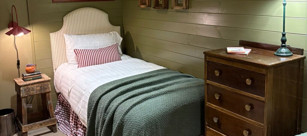 Soft curved single headboard in a traditional olive green ticking stripe fabric, made for Pattys Barn Holiday Cottages and Cabins.